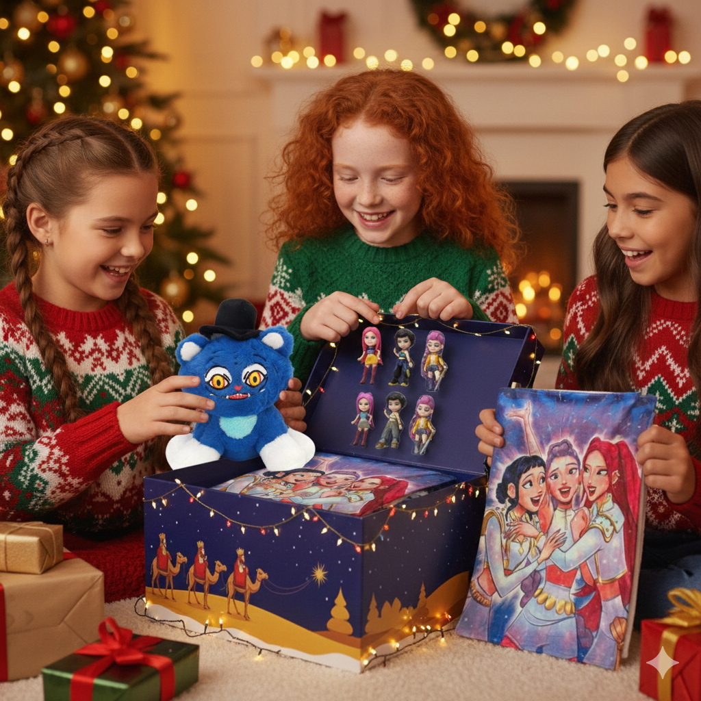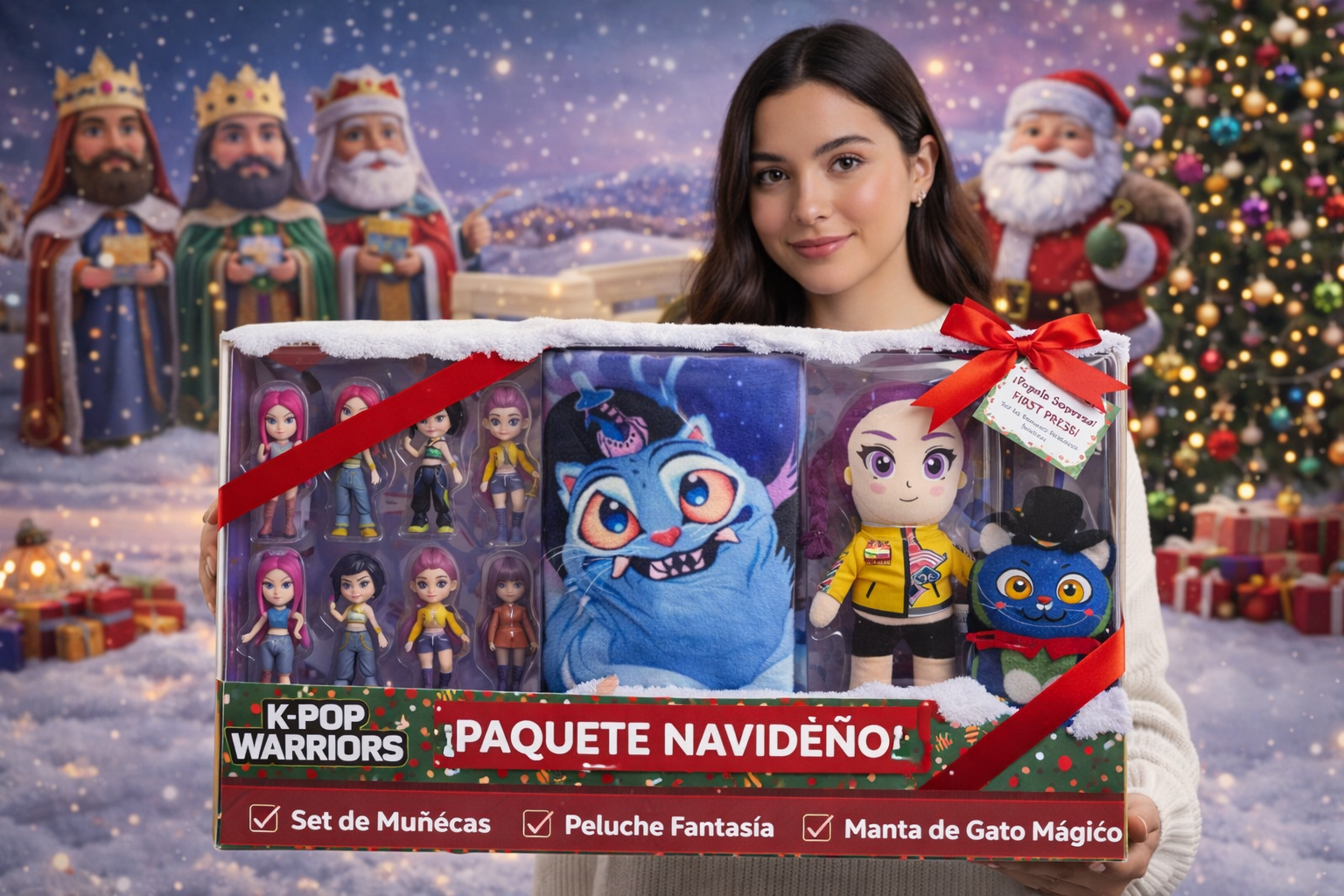 Nubi 3Pack Navideño de Guerreras Kpop: 1 Frazada Matrimonial + 1 Set de 6 Figuras + 1 Peluche 45cm + Envío Express Gratis